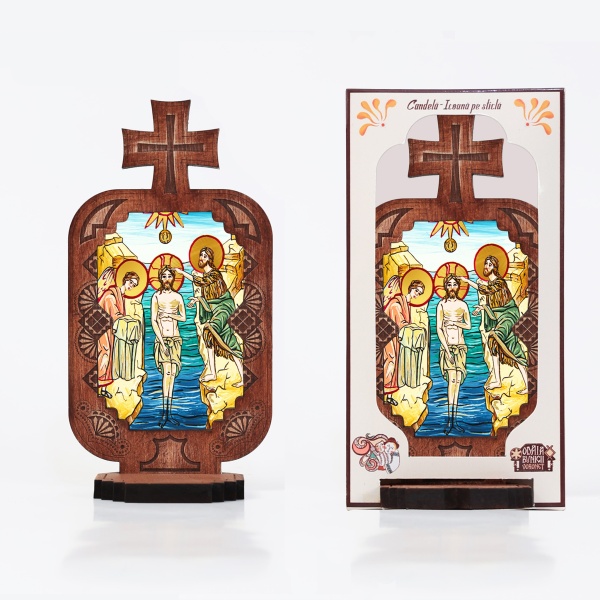 Candela din lemn cu Icoana - Botezul Domnului Iisus Hristos - 21 cm x 12 cm