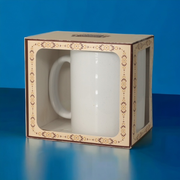 Cana alba din ceramica, cu o capacitate de 350 ml.