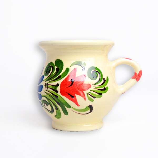 • Cană din ceramică în nuanțe de crem, roșu și verde, potrivită pentru vin, ceai sau cafea;