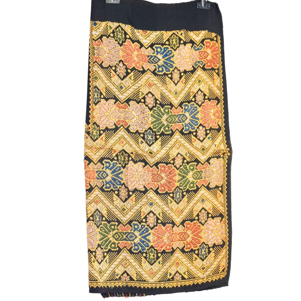 • Catrință purtată de o mireasă, lucrată manual în stative, având fondul negru din fir de bumbac și alesătură de mătase.