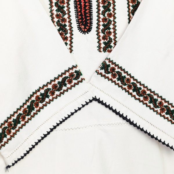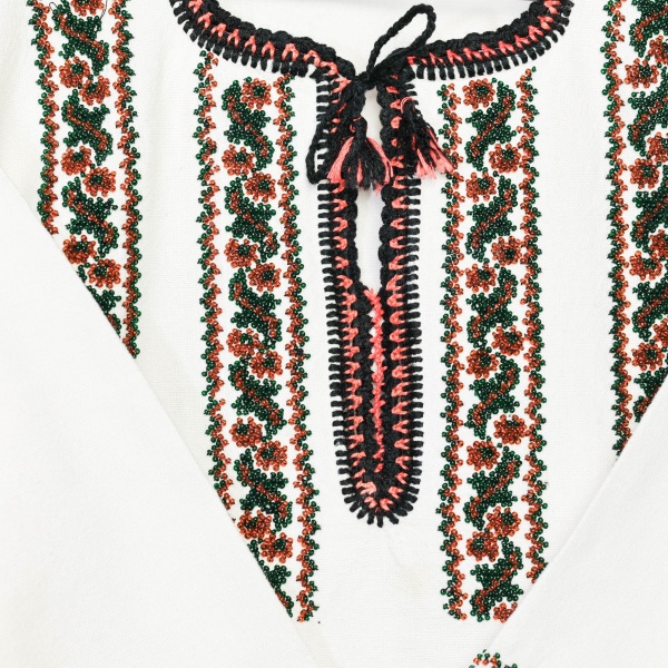• "Cămășoi" frumos din pânză de bumbac, țesută în stative, cu model înfrumusețat de mărgele din sticlă, frumos unite, rezultând motive florale, dispuse liniar.
