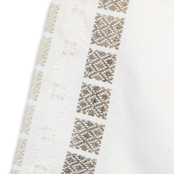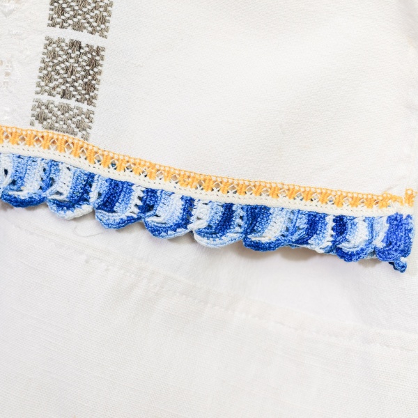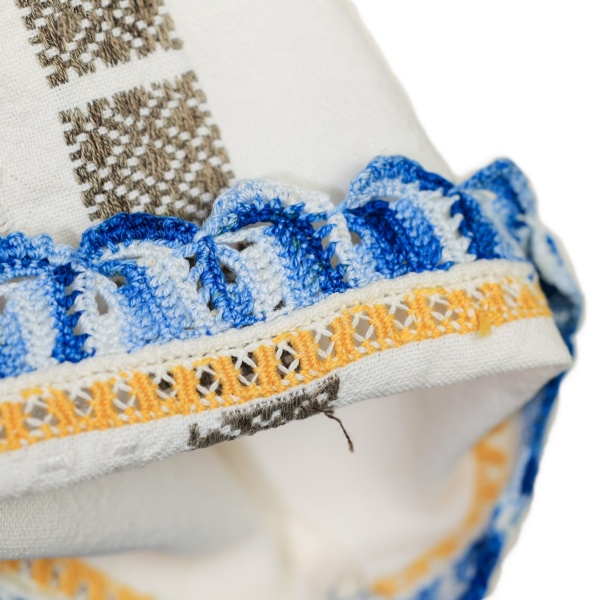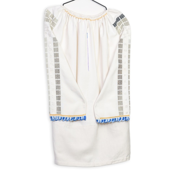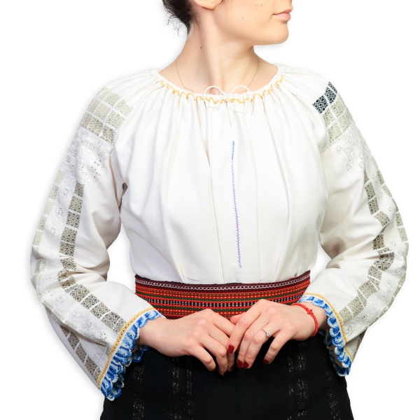 Cămașă de damă, din pânză de bumbac țesută în război. Altița și rândurile sunt de asemeni țesute, iar încrețul este executat manual cu mătase "la fir" și cu ajur. Gura este rotund strânsă în brezărău, tivit "turcește".