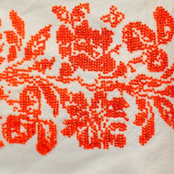 • Cămașă de damă, cusută cu mărgele de sticlă, pe pânză de bumbac, țesută în stative.