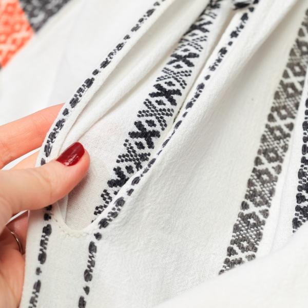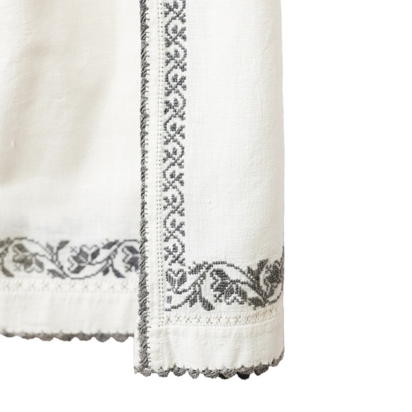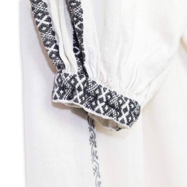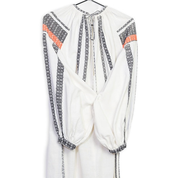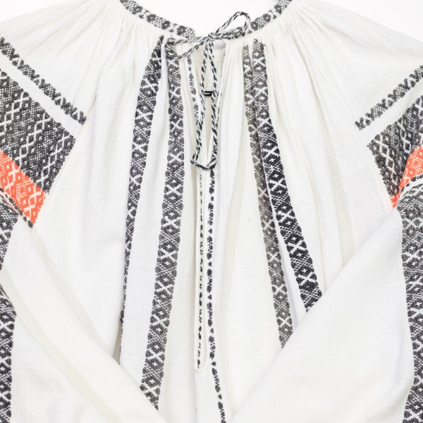 • Cămașă cu poale ce spune povești, confecționată din in, modelul fiind executat din țesătură.