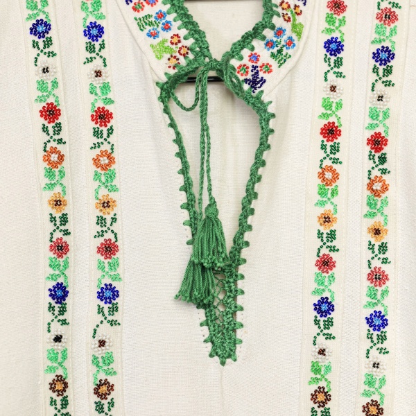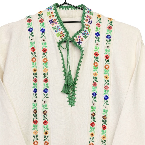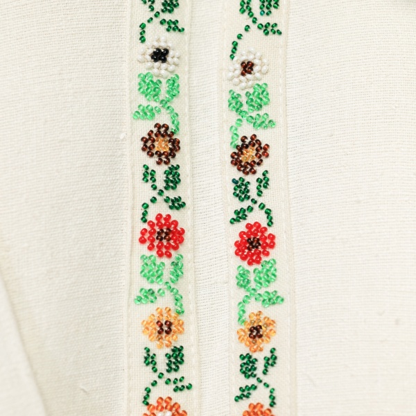 • Cămașă bărbătească din fin fir tors de in, iar pentru un plus de culoare și frumusețe au fost aplicate câte două fâșii îmbogățite cu mărgele aplicate manual.