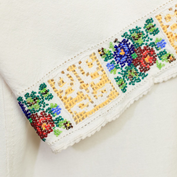 • Pânza este din in, țesută în stative și cusătură manuală cu zfir de bumbac și mărgele colorate.