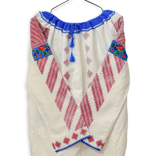 • Cămașă femeiască de in țesută în război și cu cusătură bogată în special pe mâneci.