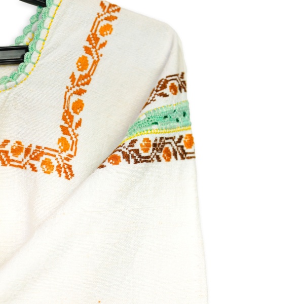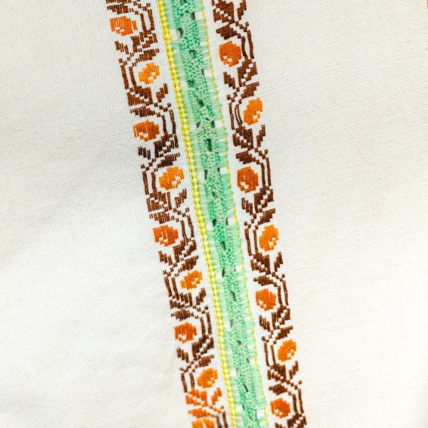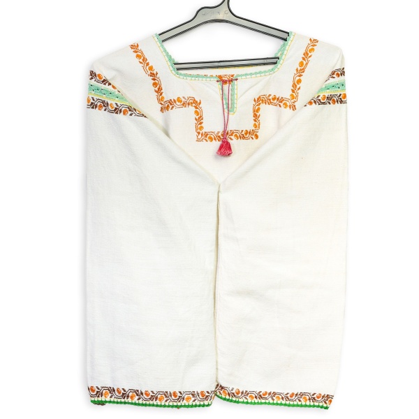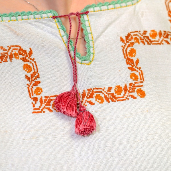• Cămașă de damă ("cămășoi") din pânză de in țesută în stative, cu model vegetal, realizată în tehnica "la fir".