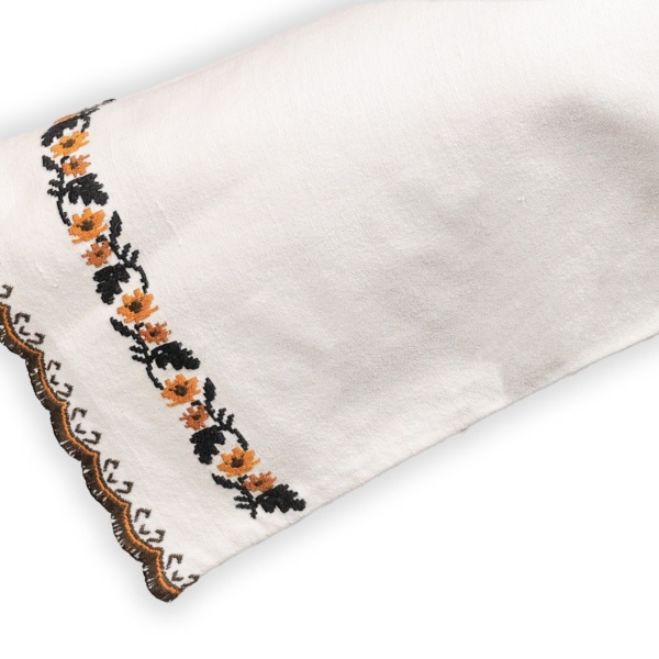 • Cusut pe pânză de bumbac țesută în război, cu motive vegetale;