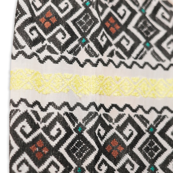 • Simboluri cusute cu fir de bumbac pe pânză fină de marchizet;
