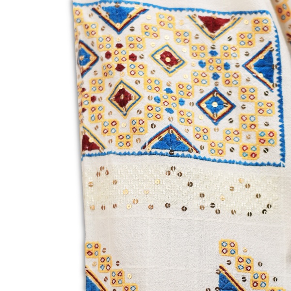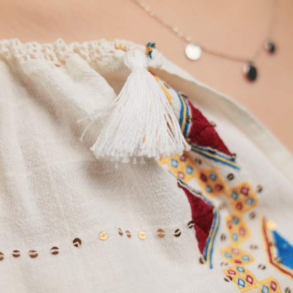 • Culori de bumbac, vii așezate pe pânză în tehnica la fir puncturi și desăvârșită cu fluturi metalici;