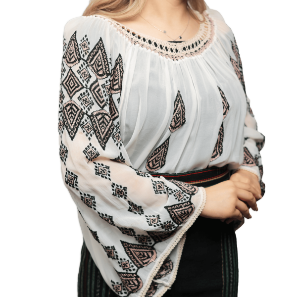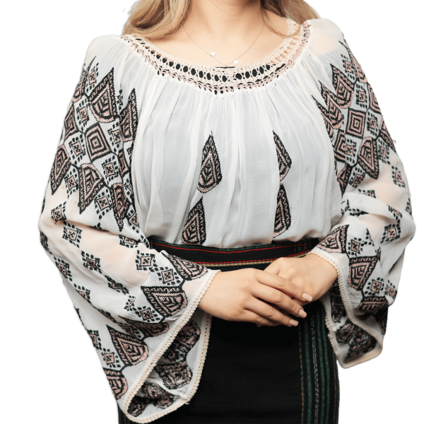 • Mânecile sunt largi, cu detalii cusute de mână, care dau eleganță acestei ii;