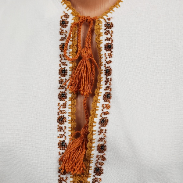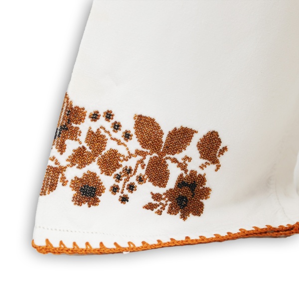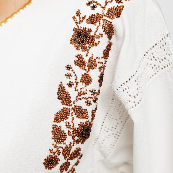 • Cămașă de damă cusută cu fir de bumbac pe pânză de in, țesut în casă;