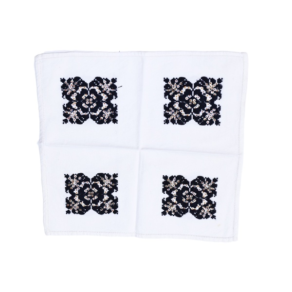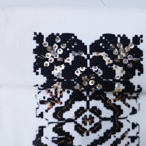 • Detaliile în nuanțe de negru, alături de paietele și mărgelele cusute manual, oferă un aspect deosebit acestui ștergar;