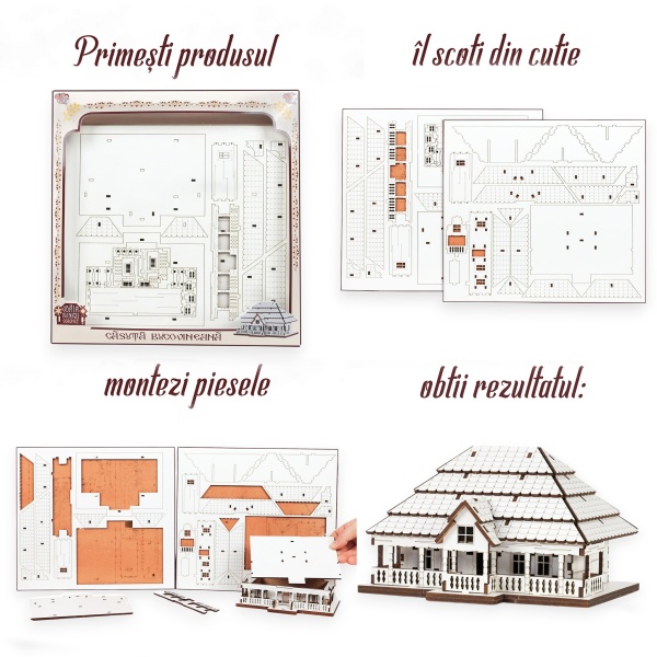 • Fiecare piesă din puzzle reprezinta un detaliu autentic al unei case bucovinene, de la pereți din lemn, până la acoperișuri din țiglă sau șindrilă care pot fi ulterior pictați dupa propria imaginatie.