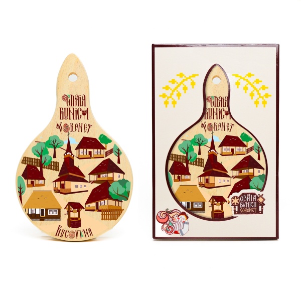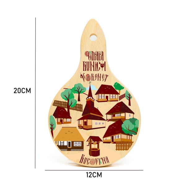 Tocator rotund din lemn - Casute si Manastiri din Bucovina - 20 cm x 12 cm