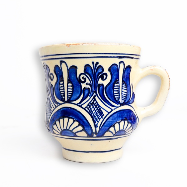 • Cană din ceramică în nuanțe de crem și albastru, potrivită pentru vin, ceai sau cafea;